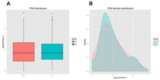 Both the HF and LF groups showed a similar median TPM value with comparable central tendencies in expression levels. However, the HF group had a slightly wider interquartile range, with greater variability in expression levels among its samples compared to the LF group. Both groups also had a few outliers, with LF showing more outliers at the higher end of the expression range (Figure 4A). In the TPM density distribution plot, the HF and LF groups demonstrated different distribution patterns. The LF group, presented in green, had a slightly higher density peak around a log (TPM + 1) value of approximately 1.5. The HF group, shown in red, had a lower peak in this region. As the expression level increased (moving right on the x-axis), the density decreased for both groups. However, the tail on the right side showed that both the HF and LF groups contained some highly expressed transcripts, although these were less frequent (Figure 4B).