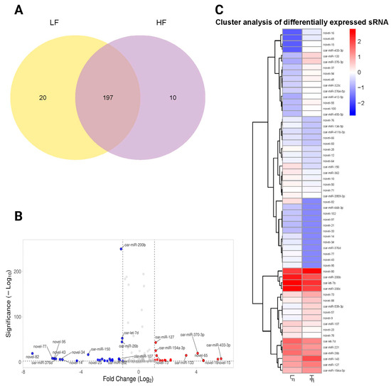 An analysis of differentially expressed miRNAs in the HF and LF groups. (A) The Venn diagram represents the number of miRNAs contained in each group (the LF label is aligned with the yellow circle, and HF is aligned with the purple circle), and the overlap represents the number of common miRNAs in the LF and HF groups. (B) The volcano plot shows differentially expressed miRNAs between the LF and GF rams (Red dots show upregulated miRNAs, blue dots show downregulated miRNAs, and gray dots represent non-significant miRNAs). (C) A heatmap of differentially expressed miRNAs between the LF and HF groups. Significantly upregulated and downregulated genes are colored in red and blue, respectively.