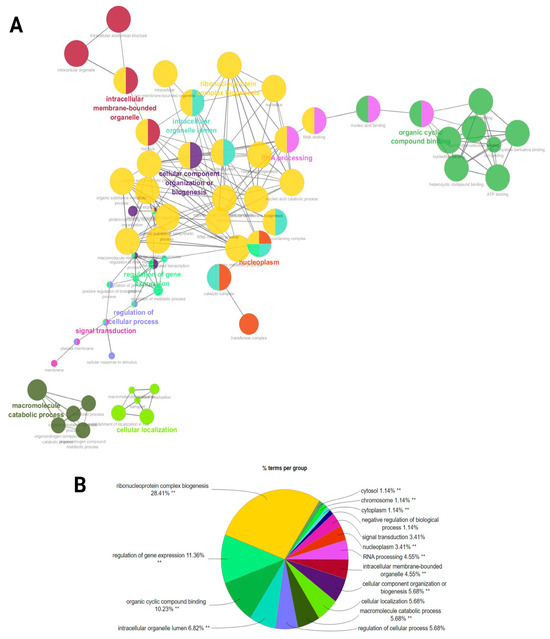 A functional network association analysis of miRNA target genes revealed critical insights into their regulatory roles across various biological processes and molecular functions as well as cellular components (Figure 6A). The network visualization demonstrated key hubs such as (GO:0022613) ribonucleoprotein complex biogenesis, (GO:0010468) the regulation of gene expression, and (GO:0006396) RNA processing. Highly interconnected clusters demonstrated the central roles of (GO:0071840) cellular component organization or (GO:0043231) intracellular membrane-bounded organelle processes (Figure 6A). The bar chart underscores the distribution of miRNA targets across enriched biological processes. Among these, (GO:0022613) ribonucleoprotein complex biogenesis stands out as the most enriched term, further supported by categories such as (GO:0003723) RNA binding, (GO:0007165) signal transduction, and (GO:0071840) cellular component organization or biogenesis, indicating the miRNA-mediated regulation of cellular communication and structural organization. The pie chart provides a quantitative breakdown, with ribonucleoprotein complex biogenesis representing the largest proportion (28.41%) of functional terms. This is followed by the regulation of gene expression (11.36%) and organic cyclic compound binding (10.23%), confirming the pivotal role of miRNAs in transcriptional regulation and ligand binding. Smaller categories include signal transduction (3.41%) and the negative regulation of biological processes (1.14%) (Figure 6B) (Supplementary File S4).