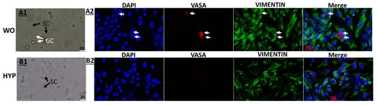 Characterization of the cells present in cultures before and after hypotonic shock in vitro. Cells were isolated and cultured as described in the materials and methods section. In the cultures without hypotonic shock (WO), we could identify the presence of adherent cells (Sertoli cells; SC) and germ cells (GC) (A1). White arrows indicate the location of VASA-positive cells in the culture. However, in the cultures treated with hypotonic shock (HYP), we could identify mainly Sertoli cells and individual germ cells (B1). Immunofluorescence staining of cultured WO, using anti-VIMENTIN antibodies (specific for Sertoli cells; green color) and anti-VASA antibodies (red color), showed the presence of both types of cells (A2), while HYP cultures showed only the presence of Sertoli cells (B2). Panels (A1,B1,A2,B2) do not correspond to the same location in the cell culture.