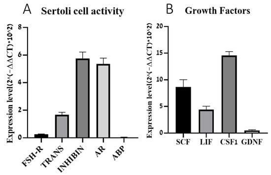 Male infertility affects approximately 20% of couples worldwide and has been linked to a variety of different causes []. Spermatogenesis is a complicated process that involves the proliferation and differentiation of spermatogonial stem cells (SSCs) to generate mature sperm [,,,]. This process occurs in the seminiferous tubules that contain the somatic cells (Sertoli cells, and peritubular cells) in addition to spermatogonial cells at different stages of development (meiotic and post-meiotic) [,,,]. FSH is produced by the pituitary gland and is involved in regulating the production of sperm through its effect on Sertoli cells [,,,]. Sertoli cells produce various factors following FSH stimulation such as androgen binding protein (ABP), androgen receptor (AR), transferrin, and inhibin b [,,,,,]. In addition, Sertoli cells produce different growth factors such as stem cell factor (SCF), colony-stimulating factor-1 (CSF-1) and glial-derived nerve growth factor (GDNF) [,,,,]. Some of the factors produced by Sertoli cells were also shown to be produced by testicular germ cells including CSF-1, GDNF, granulocyte-macrophage colony-stimulating factor (GM-CSF), interleukin-1 family, and others [,,,,,,,]. These factors affect the proliferation and differentiation of spermatogonial stem cells to generate sperm. Testosterone, the primary male sex hormone, is produced by Leydig cells in response to luteinizing hormone (LH), which is required for the development of sperm [,]. Testosterone is necessary for a critical process in spermatogenesis, supporting the completion of meiosis, differentiation, and proliferation of spermatogonia stem cells, elongated sperm adhesion to Sertoli cells, Sertoli cell proliferation, and sperm release [,]. For normal spermatogenesis, cell–cell interactions between Sertoli cells and SSCs, at different stages of development, are crucial [,,,,,,,]. Depletion of spermatogonial cells was shown to disrupt the production of normal levels of factors produced by Sertoli cells [,,]. Under chemotherapy treatments, in which testicular germ cells are mainly damaged and depleted [,,], the activity of Sertoli cells is changed [,]. This is shown in the expression levels of various factors secreted by the Sertoli cells that are involved in spermatogenesis regulation [,,].