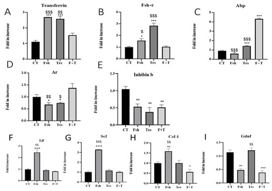 Our results show that the addition of FSH or TES significantly increased the expression level of transferrin (p < 0.001) and Fsh-r (p < 0.05 and p < 0.001, respectively) compared to the control (CT) (Figure 3A,B, respectively). However, the addition of both F + T did not affect their expression levels compared to CT (Figure 3A,B, respectively).