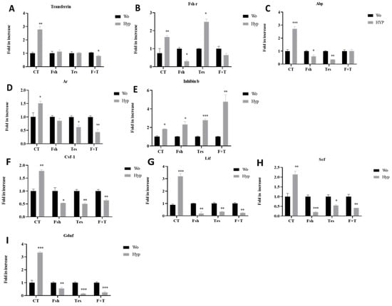 Also, the addition of TES to HYP-treated cultures did not affect the expression levels of transferrin and significantly increased the expression levels of Fsh-r (p < 0.01) and inhibin b (p < 0.001), but significantly decreased the expression levels of Abp (p < 0.01), Ar (p < 0.05), and the growth factors Csf-1 (p < 0.01), Lif (p < 0.01), Scf (p < 0.05), and Gdnf (p < 0.001), compared to the same treatment in WO cultures (Figure 4A–I, respectively, and Table 1). The addition of both FSH and TES (F + T) to HYP-treated cultures did not affect the expression levels of Fsh-r and Abp, but significantly increased the expression levels of inhibin b (p < 0.01), and significantly decreased the expression levels of transferrin (p < 0.05), Ar (p < 0.01), and the growth factors Csf-1 (p < 0.01), Lif (p < 0.01), Scf (p < 0.01), and Gdnf (p < 0.001), compared to the same treatment in WO cultures (Figure 4A–I, respectively, and Table 1).