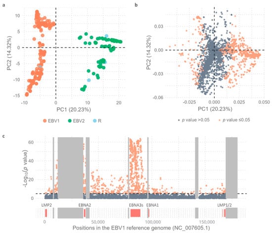 Principal Component Analysis. (a) Distribution of viral genomes based on PC1 (20.23%) and PC2 (14.32%); EBV1 (orange), EBV2 (green), and viral-type recombinants (R) (in light blue). (b) Dots represent the 4.541 variable positions; orange dots represent statistically significant values and gray dots non-statistically significant values as obtained by comparing the allelic frequencies of EBV1 and EBV2 using Fisher’s exact test and subsequent Bonferroni correction. (c) Distribution of identified variants along the genome based on the −log10(p value) when comparing the allelic frequencies of EBV1 and EBV2 using Fisher’s exact test and subsequent Bonferroni correction; orange dots represent statistically significant values and gray dots non-statistically significant values. Black dotted line represents the threshold value above which the p values are considered significant [−log10(p value) = 4.95]. Most relevant genes are represented below, according to their positions in the genome. Gray boxes represent the repetitive regions of the viral genome.
