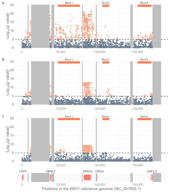 Viral type variability in (a) Africa, (b) Southeast Asia and (c) South America. Figure shows distribution of identified variants along the genome based on the −log10(p value) when comparing the allelic frequencies of EBV1 and EBV2 using Fisher’s exact test and subsequent Bonferroni correction; orange dots represent statistically significant values and gray dots non-statistically significant values. Black dotted line represents the threshold value above which the p values are considered significant [−log10(p value) AFR = 4.78; −log10(p value) SEA = 4.73 and −log10(p value) SAM = 4.75]. Most relevant genes are represented below according to their positions in the genome. Orange boxes above the graph delimit the 3 most informative blocks in terms of variable positions. Most relevant viral genes are represented as coral boxes below the graph according to their positions in the genome. Gray boxes represent the repetitive regions of the viral genome.