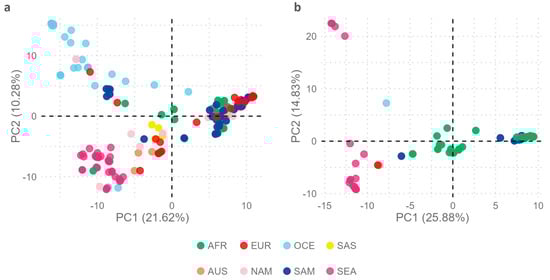 In a similar way, to study the variability of EBV2 genomes in a geographical context, a multi-sample_EBV2.vcf file was constructed from 67 EBV2 genomes and the EBV2 reference genome including 3276 variable positions (3155 SNPs and 121 INDELs) and was used as the input file for PCA. The geographical origins of EBV2 genomes were mainly restricted to AFR (38), SAM (10), and SEA (16) while only one each was present in OCE, EUR, and AUS and none in SAS and NAM. In this PCA analysis, PC1 was able to discriminate EBV2 genomes according to geographical origin (Kruskal–Wallis test; p = 1.37 × 10−9) (Figure 3b). In this way, PC1 (25.88%) allowed the differential segregation of genomes from SEA compared to genomes from AFR (Wilcoxon test, Bonferroni correction; p = 2.6 × 10−9) and SAM (Wilcoxon test, Bonferroni correction; p = 1.1 × 10−7); however, it did not explain the variability between AFR and SAM genomes (Wilcoxon test, Bonferroni correction; p = 1). Additionally, PC1 revealed two subpopulations of EBV2 in Africa since 18 genomes presented with PC1 values close to 0 [median: 0.93; (Min.: −1.13–Max.: 3.44)] and 19 genomes had PC1 values > 0 [median: 9.48; (Min.: 8.02–Max.: 9.74)], a phenomenon not observed in the PCA derived from EBV1 genomes. On the other hand, PC2 (14.83%) contributed less in explaining the geographical segregation of EBV2 genomes (Kruskal–Wallis test; p = 0.0027); similarly to PC1, it allowed the segregation of genomes from SEA with respect to isolates from AFR and SAM (Wilcoxon test, Bonferroni correction; p = 0.023), but could not explain the variability between AFR and SAM genomes (Wilcoxon test, Bonferroni correction; p = 1) (Figure 3b).