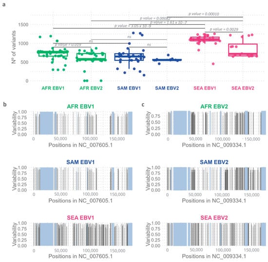 To further explore the observed geographic variability, the number of variable positions relative to the reference genomes of EBV1 and EBV2 were quantified using the information from each multi-sample.vcf file. A significant difference was observed between both viral types (Wilcoxon test, p = 0.0001), with EBV2 showing less variability relative to its reference genome as compared to the variability of EBV1 isolates relative to the EBV1 reference. When considering each geographical origin independently, no significant differences in the median number of variants between viral types were found in SAM (Wilcoxon test, p = 0.12); however, in AFR and SEA, the median number of variants in EBV2, relative to its reference, was lower than that observed for EBV1 (Wilcoxon test, p AFR = 0.019 and p SEA = 0.0029) (Figure 4a). In addition, the number of variable positions relative to the corresponding reference genome showed significant differences among geographic regions for both viral types (Kruskal–Wallis test; p EBV1 = 3.69 × 10−10; p EBV2 = 0.00010). In this context, EBV genomes from SEA, regardless of the viral type, showed a higher number of variable positions in comparison to that observed in isolates from AFR (Wilcoxon test; p EBV1 = 3.05 × 10−9; p EBV2 = 0.00082) and SAM (Wilcoxon test; p EBV1 = 1.61 × 10−7; p EBV2 = 0.00010) (Figure 4a). Common variable positions, present in more than 75% of the sequences, were plotted in relation to their positioning in the genome to further analyze and compare their precise location along each type-specific genome in each geographic region (see Supplementary Table S7, Figure 4b,c). With these settings, variable positions in SEA EBV1 genomes were distributed evenly throughout the entire viral genome; however, in SEA, EBV2 genomes variable positions were restricted to discrete regions in the genome (Figure 4c). On the other hand, variability patterns observed in AFR and SAM were similar although type-specific. While, in EBV1 genomes, both AFR and SAM exhibited significant variability between 75,000 and 110,000 bp, EBV2 genomes concentrated the majority of variable positions in the region adjacent to 50,000 bp and the region between 110,000 and 150,000 bp.