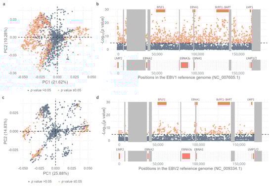 To unequivocally identify those precise variable positions that contributed to the segregation of the genomes in relation to their geographic origins, the distribution and significance of each variable position in the multi-sample_EBV1.vcf and multi-sample_EBV2.vcf files were assessed for both viral types by a PCA (Figure 5).