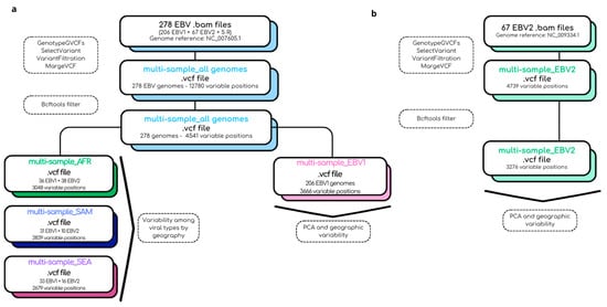 Summary of the bioinformatic pipeline used for the construction of multi-sample.vcf files. (a) The reads were aligned to the EBV1 reference genome (NC_007605.1) to generate a multi-sample .vcf file consisting of 278 viral genomes. From this file, the corresponding subsets for EBV1 and geographic regions were then generated. (b) The reads were aligned to the EBV2 reference genome (NC_009334.1) to generate a multi-sample .vcf file consisting of 67 EBV2 viral genomes.