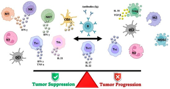 The intracellular interaction between different leukocyte subsets and their predominant roles in either stimulating or inhibiting tumor growth, including myeloid lineage leukocytes, tumor-associated macrophages (M) with both pro- and antitumor properties, various helper T-cell subsets (Th), cytotoxic T cells, regulatory T cells (Tregs), dendritic cells (DCs), natural killer cells (NK), neutrophils (N), B cells, and myeloid-derived suppressor cells (MDSC). The figure is adapted from Salgado et al. [].