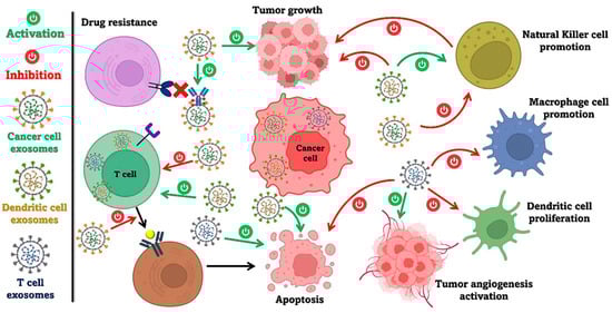 Exosomes serve as a natural transporter of a wide array of bioactive compounds derived from donor cells, involving lipids, proteins, and different types of RNAs such as long non-coding RNAs (lncRNA), microRNAs, inhibitors, and antibodies []. Exosomes can transmit these molecules to nearby as well as distant recipient cells. Consequently, exosomes garnered significant attention as a potential natural carrier of cancer therapies. The impact of exosomes on cancer growth and progression varies depending on their cellular source, influencing the course of the disease. Exosomes secreted by cancer cells are implicated in shaping the pre-metastatic microenvironment, facilitating tumor advancement, immune evasion, anti-apoptotic signaling, angiogenesis, treatment resistance, and various other processes [,,]. In contrast, exosomes originating from normal cells, such as T and B lymphocytes and DCs, play a critical role in preventing tumor progression [,].