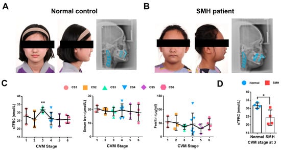 The patients with SMH exhibited a protrusive profile, small jaw and deep overjet (Figure 1A,B). To further investigate iron metabolism during the pubertal growth peak, we analyzed the serum samples of 27 normal subjects at CS1–6 for various iron metabolism indicators in addition to the previously detected serum TF level [27]. Notably, the serum soluble transferrin receptor 1 (sTFRC) level reached its peak value at CS3 compared to CS6. Serum iron and ferritin levels remained stable during CS1–6 (Figure 1C). Detailed information regarding these findings is provided in Appendix A Table A1. Additionally, serum samples were also collected and compared from four SMH patients and four normal subjects at CS3, revealing that the sTFRC level of the SMH patients was significantly lower than that of the normal subjects (Figure 1D). Further details are available in Appendix A Table A2.