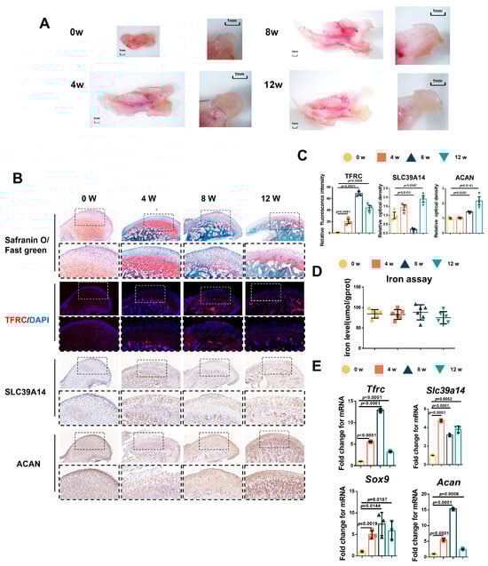 Due to the challenges in obtaining samples of adolescent condyle tissue, we tested the relationship between condylar cartilage development and the expression of TFRC and SLC39A14 in mice at different time points. The results showed that the mandibular condyles of newborn mice were predominantly composed of transparent cartilage (0 week). As the mice grew, the condyle gradually elongated and ossified, with cartilage-covered parts forming, particularly during the newborn to postnatal 4-week period (Figure 2A). Safranin O/fast green staining indicated that the condyle of newborn mice was mainly composed of cartilage, which became relatively thin over time, with mature hypertrophic cartilage being replaced by bone trabecula (Figure 2B). Considering the crucial roles of TFRC and SLC39A14 in maintaining iron ion levels, we analyzed the expressions of TFRC, SLC39A14 and the chondrogenic biomarker ACAN in the mouse condyle tissues. IF demonstrated that TFRC expression was mainly concentrated in the cartilage proliferative layer, hypertrophic layer and subchondral bone of the condyle after 4 weeks. IHC also revealed a slight distribution of SLC39A14 in the proliferative and hypertrophic layers of condylar cartilage after birth, with a slight decrease in expression at 8 weeks. Furthermore, IHC showed that ACAN expression was abundant in the proliferative and hypertrophic layers during condyle growth progression (Figure 2B). The semi-quantitative calculation results of IF and IHC are shown in Figure 2C. Total iron content maintained at a degree in condylar cartilage from 0 w to 12 w mice (Figure 2D). qPCR analysis showed that the expression of Tfrc, Sox9 and Acan were significantly increased and peaked while the expression of Slc39a14 reached its low value at 8 weeks postnatal (Figure 2E).