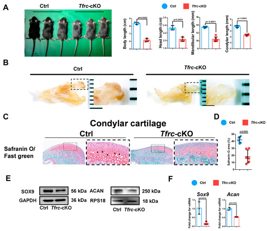 The expression of the chondrogenic differentiation markers, Sox9 and Acan, in the condylar cartilage at the mRNA level were decreased in the Tfrc-cKO mice group compared to the control group. The Western blot also showed that SOX9 and ACAN were decreased in the Tfrc-cKO mice. These demonstrated there was weaker chondrogenic differentiation in the condylar growth of the Tfrc-cKO mice (Figure 3E,F).