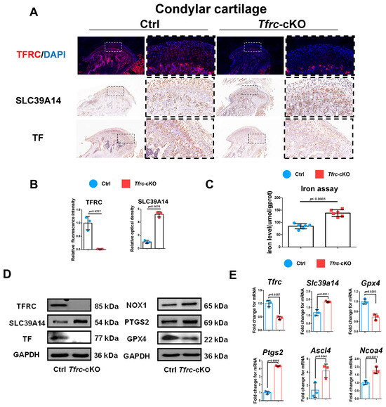 Considering that TFRC and SLC39A14 are TBI- and NTBI-ion transporters, respectively, and the accumulation of iron ions can cause ferroptosis, we detected TFRC and SLC39A14 expression in the condylar cartilage of the mice. IHC and IF displayed that the expression of TFRC was knocked out and that SLC39A14 was increased in the proliferative and hypertrophic layers of the condyle in the Tfrc-cKO mice (Figure 4A). The semi-quantitative calculation results of IF and IHC are presented in Figure 4B. There is more iron content shown in the iron assay but less TF expression shown in the IHC results within the cartilage tissue of the Tfrc-cKO mice (Figure 4A,C). This demonstrates that NTBI was accumulated in the cartilage of the Tfrc-cKO mice.