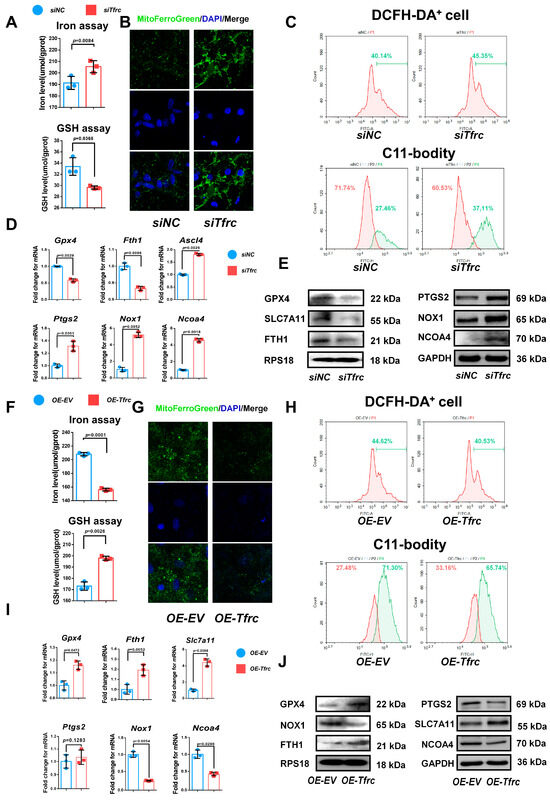 To investigate whether mitochondrial stress was associated with ferroptosis, a calcein AM fluorescence probe was used to assess mitochondrial permeability. The results indicated that cells in the siTfrc group exhibited weaker fluorescence intensity compared to the control group, suggesting a higher number of open mitochondrial transition pores in the siTfrc group (Figure 7J). On the contrary, there were fewer mitochondrial transition pores open in the OE-Tfrc group than the control group (Figure 7K). MitoSOX Red staining revealed increased mitochondrial ROS production in the siTfrc group compared to the siNC group (Figure 7L). Overexpression of Tfrc effectively reduced mitochondrial ROS generation (Figure 7M).