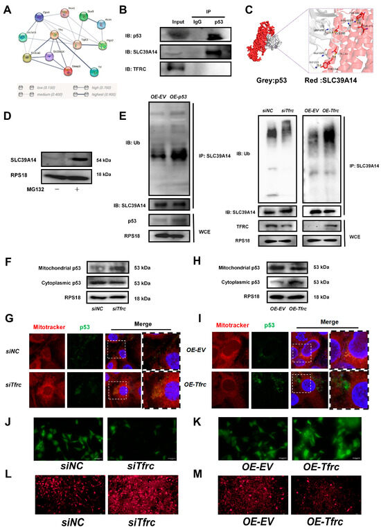 The FRC–SLC39A14 expression switch regulates ferroptosis through mitochondrial p53 translocation in ATDC5 cells (A) Using the String website (cn.string-db.org) to predict the correlation between protein molecules, it was found that p53 were highly correlated with TFRC, SLC39A14, and ferroptosis-related signaling molecules. (B) co-IP analysis of protein interaction between p53, SLC39A14 and TFRC. (C) Using Hdock (hdock.phys.hust.edu.cn) to dock ZIP14 and p53 interaction. The result of molecular docking showed that the binding energy of p53 and SLC39A14 was −320.84 kcal/mol. The residues around the protein–protein interaction interface could form hydrogen bonds. The interaction mode of docking results was analyzed by Pymol 2.3.0. The amino acid residue GLY-223, GLU-225, LEU-108 and ASN-103 of p53 formed hydrogen bonds with TYR-154, CYS-158, CYS-165, THR-471 and TYR-187 of SLC39A14, respectively. The length of hydrogen bonds was 2.0Å,3.8Å, 3.4Å, 2.8Å and 3.0Å. These hydrogen bonds could help stabilize protein–protein complexes. (D) Western blot analysis of SLC39A14 expression after treatment with proteasome inhibitor MG132. (E) Western blot analysis of ubiquitination level of SLC39A14 after p53 overexpression, Tfrc overexpression and Tfrc knockdown. (F) Western blot analysis of mitochondrial p53 and cytoplasmic p53 level in siNC and siTfrc groups. (G) Fluorescence images of cells and mitochondria to detect p53 translocation in siNC and siTfrc groups. (H) Western blot analysis of mitochondrial p53 and cytoplasmic p53 level in OE-EV and OE-Tfrc groups. (I) Fluorescence images of cells and mitochondria to detect p53 translocation in OE-EV and OE-Tfrc groups. (J) Calcein AM fluorescence probe was used to detect mitochondrial permeability in siNC and siTfrc groups. (K) Calcein AM fluorescence probe was used to detect mitochondrial permeability in OE-EV and OE-Tfrc groups. (L) The images of fluorescence microscope detecting ROS (MitoSOX red) generated by mitochondria in siNC and siTfrc groups. (M) The images of fluorescence microscope detecting ROS (MitoSOX red) generated by mitochondria in OE-EV and OE-Tfrc groups.