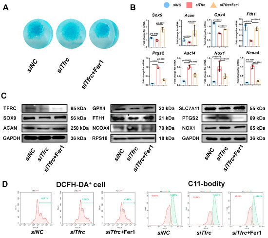 To determine whether ferroptosis contributes to siTfrc-induced chondrogenic dysfunction, we introduced Fer1, a potent and selective ferroptosis inhibitor, into the siTfrc-induced cell medium. Alcian blue staining of the micromass culture revealed that chondrogenic function was restored in the cells treated with Fer1 (Figure 8A). qPCR and Western blot analysis showed that the expression of SOX9 and ACAN was enhanced in the Fer1 group compared to the siTfrc group. The expression of the ferroptosis-related GPX4, SLC7A11 and FTH1 was increased while that of PTGS2, NOX1 and NCOA4 was decreased in the Fer1 group (Figure 8B,C). Flow cytometry analysis showed reduced ROS generation in the Fer1 group, with 43.98% DCFH-DA+ cells compared to 51.42% in the siTfrc group. The oxidation–reduction ratio was also more balanced in the Fer1 group (54.62% vs. 43.08%) compared to the siTfrc group (63.37% vs. 35.04%) (Figure 8D).