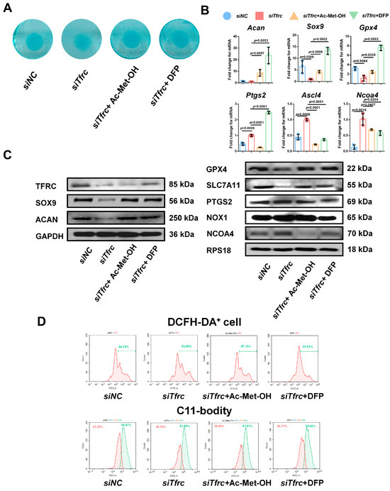To alleviate the ROS generated by the Fenton reaction, cells in the siTfrc group were treated with Ac-Met-OH, a kind of ROS scavenger. Alcian blue staining of the micromass cultivation showed more active chondrogenesis in the cells treated with Ac-Met-OH (Figure 9A). qPCR analysis indicated the restored and increased expression of Sox9, Acan and Gpx4, while highly expressed genes ptgs2, Ncoa4 and Ascl4 were inhibited after Ac-Met-OH treatment (Figure 9B). Western blot analysis confirmed the suppression of PTGS2 and NCOA4 levels and the elevation of SOX9, ACAN, GPX4 and SLC7A11 levels in the Ac-Met-OH-treated cells (Figure 9C). Flow cytometry revealed 47.13% DCFH-DA+ cells in the Ac-Met-OH group, and the oxidation–reduction ratio, measured by the C11-BODITY fluorescence probe, was 61.01% vs. 36.92% in the Ac-Met-OH group (Figure 9D).