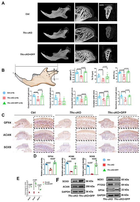 To ascertain the occurrence of ferroptosis in the condylar cartilage of mice and to perform an in vivo rescue assay, DFP was administered to the Tfrc-cKO mice through temporomandibular joint injections. Examination of the condyle in the Tfrc-cKO mice revealed degraded and loose bone trabeculae. Notably, following DFP treatment, the sub-cartilage bone trabeculae of the condyle exhibited thickening (Figure 10A). The length of the horizontal, vertical, and oblique axes of the condyle obtained a certain degree of recovery. The C-F length of the condyle of the control mice, cKO mice and Tfrc-cKO mice treated with DFP were 3.03 ± 0.11 mm, 2.64 ± 0.21 mm and 2.99 ± 0.23 mm, respectively. The mandibular lengths were 13.33 ± 1.06 mm, 11.19 ± 1.01 mm and 13.43 ± 0.44 mm, respectively. The other detailed data are shown in Figure 10B. IHC analysis showed that the levels of SOX9, ACAN, and anti-ferroptosis marker GPX4 decreased in the proliferative and hypertrophic layers of the Tfrc-cKO mice. However, these expressions could be significantly restored following the temporomandibular joint injection of DFP (Figure 10C). The semi-quantitative calculation results of IF and IHC are shown in Figure 10D. After the DFP treatment, SOX9, ACAN and GPX4 expression were increased at the mRNA and protein levels, along with decreased PTGS2 and NOX1 expression at the protein level in the condylar chondrocytes (Figure 10E,F). The results indicate that DFP rescues mandibular (condyle) hypoplasia of the Tfrc-cKO mice by eliminating iron overload-mediated ferroptosis.