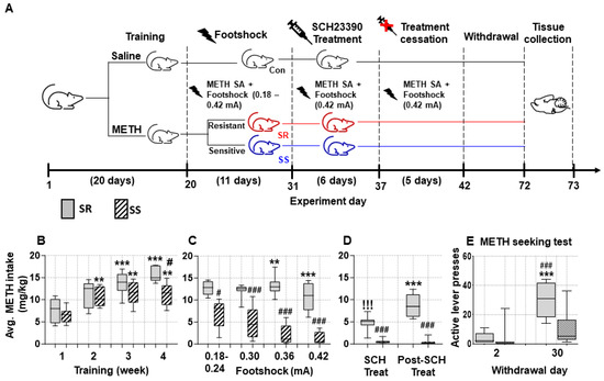 Drug-naive rats were allowed to self-administer METH (0.1 mg/kg/infusion) and saline during three 3 h sessions (9 h/day) with a 30 min time interval between each session using an FR1 schedule [10,11,12,13,14,15]. There was a 20 s timeout between each infusion as described in our previous papers. After rats had escalated their intake of METH, they received increased intensity of contingent footshocks that led to their segregation into shock-resistant and shock-sensitive rats [12]. The detailed METH SA training procedures are described in the Supplementary Text, Section S2. The time sequence for the various phases of behavioral experiments is shown in Figure 1A.