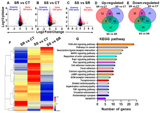 RNA sequencing revealed large-scale changes in gene expression in the dorsal striatum. Analysis of raw sequencing data using log2 fold changes and log10 p-values revealed many differentially expressed genes in pairwise comparisons shown as volcano plots: (A) SR vs. CT, (B) SS vs. CT, and (C) SS vs. SR. The Venn comparison was shown in (D) up-regulated and (E) down-regulated genes. (F) Hierarchical clustering of differentially expressed genes across 3 pairwise comparisons. The red color represents over-expressed genes, the blue color represents genes with reduced expression, while the yellow color represents genes with no changes in expression. (G) KEGG analysis shows the pathway distribution of differentially expressed genes according to DAVID.