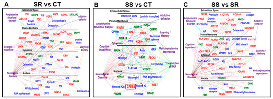 Ingenuity pathway analysis (IPA) (A) SR vs. CT, (B) SS vs. CT, and (C) SS vs. SR identifies a molecular network that differentially expressed genes are involved in addiction, drug dependence, cognitive impairment, learning, and memory (the red color indicates upregulated genes, the green color represents downregulated genes, and the blue color represents interacting gene partners).