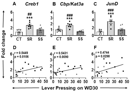 Increase mRNA expression of (A) Creb, (B) Kat3a/Cbp, and (C) JunD in the dorsal striatum of SR rats compared to CT and SS. Regression analysis revealed a positive correlation between active lever responding on WD30 and fold change for (D) Creb, (E) Kat3a/Cbp, and (F) JunD. CT, saline; SR, shock-resistant; and SS, sensitive rats. Key to statistics, * p < 0.05, ** p < 0.01, *** p < 0.001, comparisons between METH groups (SR and SS) and controls (CT); # p < 0.05, ## p < 0.01, ### p < 0.001, comparison between SR and SS.
