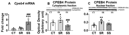 We used q-PCR to validate the findings of up-regulated Cpeb4 (F (2,19) = 5.332, p = 0.0145) in the non-compulsive rats (Figure 5A). Unexpectedly, Western blot analysis revealed lower cytoplasmic CPEB4 protein expression (F (2,18) = 13.34, p = 0.0003) in the sensitive rats in comparison to CT and resistant rats (Figure 5B). Because regulation of RNA processing and translational control depends on shuttling of CPEBs between the nucleus and cytoplasm [48,49], we also measured CPEB4 in the nuclear fraction and found non-significant increases (30%) in its protein levels in the sensitive rats (Figure 5C). We decided to also measure the mRNAs for other members of the CPEB family (Cpeb1, Cpeb2, and Cpeb3). There were no changes in Cpeb1 mRNA, but significant decreases in CPEB1 protein levels [F (2,18) = 45.46, p < 0.0001] in both compulsive and non-compulsive rats (Figure S1A,B), suggesting that exposure to METH was enough to impact striatal CPEB1 protein expression. In addition, the sensitive (SS) rats exhibited increased Cpeb2 mRNA levels (F (2,17) = 8.168, p = 0.0033) in comparison to the other two groups, with there being decreased protein levels (F (2,19) = 4.443, p = 0.0261) only in the resistant (SR) animals compared to controls (Figure S1C,D). SR and SS rats displayed no significant changes in Cpeb3 mRNA expression, whereas SR rats showed significantly increased CPEB3 protein levels (F (2,19) = 9.595, p = 0.0013) (Figure S1E,F).
