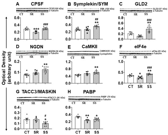The mRNAs with short poly(A) tails continued to be in a translationally inactive state by the protein–protein interaction complex of CPEB-maskin-eIF4E. Upon stimulation by CaMKII/AURKA/CDK1, CPEBs recruit protein complexes, and short poly(A) tail mRNA undergoes cytoplasmic polyadenylation with the help of GLD2, which leads to increased binding of PABP to eIF4G, which helps dislocate maskin from eIF4E, thereby allowing the commencement of translation [51]. There was a significant increase in the protein expression for CaMKII (F (2,17) = 7.372, p = 0.005) in the SS rats in comparison to CT rats (Figure 6E), but the levels of AURKA and CDK1 remain unaffected (Figure S2B,C). Other CPEB4-related proteins of interest included elF4E, which showed significant increases (F (2,18) = 21.22, p < 0.0001) (Figure 6F), and maskin/TACC3, whose protein levels were significantly decreased (F (2,17) = 5.985, p = 0.0108) (Figure 6G) in the SS rats compared to SR and control rats. Furthermore, PABP protein levels were also significantly decreased (F (2,18) = 9.108, p = 0.0019) in SR and SS rats compared to CT (Figure 6H).