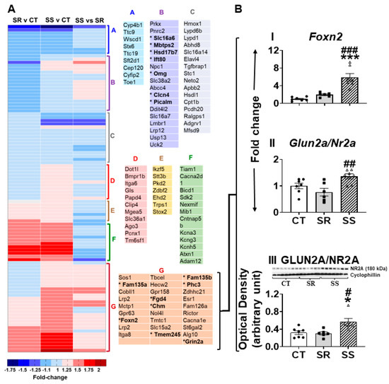 As shown above, GLD2 protein levels were increased in the SS rats (Figure 6C). GLD2 belongs to a family of poly(A) polymerases that protect mRNAs from deadenylation, thereby increasing their stability [52,53,54,55]. GLD2 is also a known regulator of biological processes involved in development and gametogenesis [27,52,56]. Moreover, GLD2 participated in regulating synaptic plasticity and long-term memory formation [52,53,57] by regulating gene expression [39]. We thus seek to identify potential GLD2 targets [39] in our RNA sequencing analysis in order to determine if GLD2 targets genes might also participate in promoting shock-induced suppression in our model (Figure 7A). Using quantitative RT-PCR, we were able to confirm upregulation for Foxn2 (F (2,17) = 24.32, p < 0.0001) and Glun2a (F (2,17) = 6.849, p = 0.0066) in the SS rats (Figure 7B(I,II)). Because the glutamatergic system is important in neuroadaptive changes caused by stimulants [58,59], and GLUN2A surface protein expression during synaptic plasticity is mediated through CPEB and CPEB-associated factors GLD2 and NGDN [39,57], we decided to measure its protein expression. We also found that GLUN2A protein levels were significantly increased (F (2,16) = 6.869, p = 0.0070) in the abstinent rats in comparison to the control and compulsive (SR) groups (Figure 7B(III)).