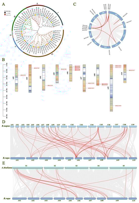 Genome-wide identification and analysis of BrGLYI gene family in winter B. rapa: (A) The phylogenetic relationships of BrGLYΙ across different plant species were analyzed through the construction of a phylogenetic tree. This tree was generated using the Neighbor-Joining method in MEGA11, based on multiple sequence alignments. Bootstrap values, obtained from 1000 replicates, are displayed above the branches to indicate support levels. A total of 63 GLYI proteins, including B. napus (35), B. rapa (17), and A. thaliana (11), were included in the phylogenetic analysis of BrGLYΙ. Subfamilies I to VI are color-coded. “At”, “Bna”, and “Br” refer to the proteins in A. thaliana, B. napa, and B. rapa. Additionally, proteins from these species are marked with specific symbols: yellow circles for A. thaliana, green triangles for B. napus, and red stars for B. rapa. The sequences utilized in this analysis are provided in the Supplementary File. (B) The chromosomal distribution of GLYI genes in B. rapa. (C) Analysis of homology and collinearity among members of the BrGLYI gene family. (D) Comparative analysis of homology and collinearity between BrGLYI and BnaGLYI. (E) Comparative analysis of homology and collinearity between BrGLYI and AtGLYI.