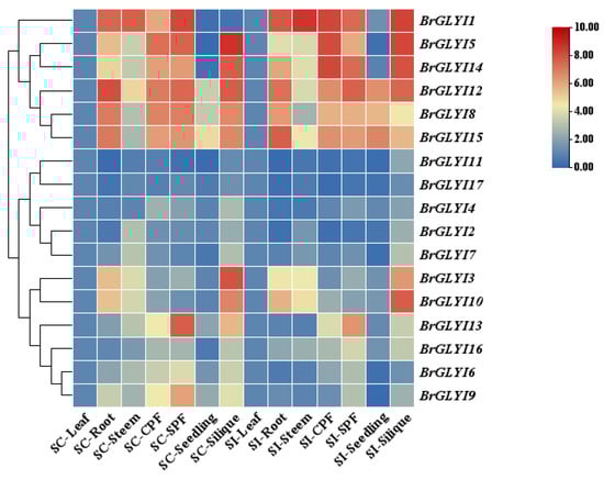 Expression of BrGLYI gene family in different tissues. SC: self-compatibility material; SI: self-incompatibility material; CPF: cross-pollinated flowers; SPF: self-pollinated flowers. Relative gene expression was calculated using the comparative 2−ΔΔCT method. All data were standardized using actin as an internal reference gene. Three independent biological replicates were performed. The color scale indicates the log2-transformed average relative expression levels from the three replicates, with data normalized to the expression levels in leaf tissue.