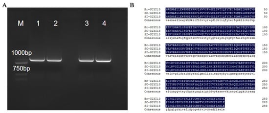 (A) Identification of BrGLYI13 gene-positive clones. Note: M: DL2000; Lanes 1, 2: PCR amplification products of self-compatible lines 039-1; Lanes 3, 4: PCR amplification products of self-incompatible lines GAU-28-5. “M” represents the molecular weight marker (Marker). (B) Results of BrGLYI13-encoded protein sequence alignment.