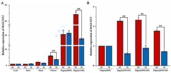 BrGLYI13 tissue expression specificity. (A) Expression levels of BrGLYI13 in different tissues. BSP: Before Self-Pollination; ASP: After Self-Pollination; the stigma collection was performed 30 min after self-pollination. Relative gene expression was calculated using the comparative 2−ΔΔCT method. All data were normalized to the actin expression level as an internal control, with expression levels in leaf tissue set to 1. Three independent biological replicates were performed. The “**” symbol indicates a significant difference (p ≤ 0.05) according to analysis of variance. (B) Expression levels of BrGLYI13 in stigma tissues of B. rapa with different compatibility types under different self-pollination times. BSP: Before Self-Pollination; MASP: Minutes After Self-Pollination. Relative gene expression was calculated using the comparative 2−ΔΔCT method. All data were normalized to the actin expression level as an internal control, with expression levels in pre-self-pollinated stigmas set to 1. Three independent biological replicates were performed. The “**” symbol indicates a significant difference (p ≤ 0.05) according to analysis of variance.