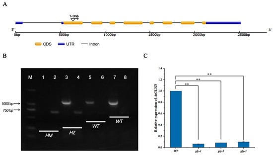 Identification of gly homozygous mutants. (A) AtGLYI3 gene structure and T-DNA insertion site. “M” represents the molecular weight marker (Marker). (B) Gene-level detection in gly mutants: HM represents homozygous A. thaliana strain, HZ represents heterozygous A. thaliana strain, and WT represents wild-type A. thaliana strain. Channels 1, 3, 5, and 7 correspond to LR + PR, while channels 2, 4, 6, and 8 correspond to LB + RP. (C) Detection of transcription levels of gly mutants. Relative gene expression was calculated using the comparative 2−ΔΔCT method. All data were normalized to the actin2 expression level. Three independent biological replicates were performed. The “**” symbol represents significant difference (p ≤ 0.05) according to analysis of variance.