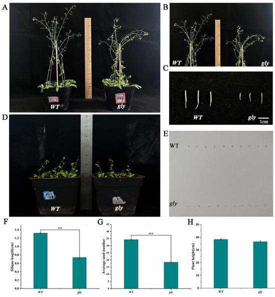 Phenotypes of WT and gly. (A) Plants with seeds germinated for 65 days. (B) Flower buds and siliques on the main stem. (C) Comparison of silique length and width between gly and WT plants. (D) Plants with seeds germinated for 28 days. (E) Comparison of seed size between gly and WT plants. (F) Silique lengths of gly and WT plants. The symbol “**” indicates that the mean expression value is significantly different from that of the WT (p < 0.01). (G) Average numbers of seeds in gly and WT plants. The symbol “**” indicates that the mean expression value is significantly different from that of the WT (p < 0.01). (H) Plant heights of gly and WT plants.