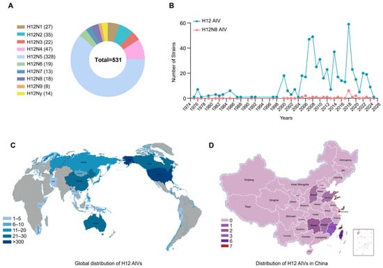 Global prevalence of H12 subtype viruses. (A) The HA and NA combinations of H12Ny strains in the database. (B) The isolation date of the H12 subtype viruses. (C) The global distribution of the H12 subtype viruses. (D) The distribution of the H12 subtype viruses in China. Sequences of the H12 subtype viruses were all retrieved in GISAID and GenBank databases to analyze the host, distribution, and isolation years of the viruses. All the public data utilized in this study from GISAID and GenBank were current as of 9 February 2025.