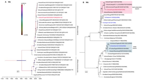Phylogenetic analyses of HA and NA genes. (A) Maximum Clade Credibility (MCC) tree of the HA gene. Bayesian time-measured phylogenetic tree of HA was constructed with the BEAST software package (v1.10.4) and then visualized by using FigTree (v1.4.4). Branches are colored according to posterior probability, and the node bars indicate the 95% highest posterior density of the node height. (B) Phylogenetic tree of NA gene was constructed by employing the maximum-likelihood method with the IQ-TREE algorithm. The NA tree was rooted to A/equine/Miami/1/1963(H3N8). The H12N8 virus isolated in this study is shown in red, while human isolates were shown in blue. The regions of nucleotide sequence used for the phylogenetic analyses were as follows: HA, 29-1732, and NA, 19-1431.