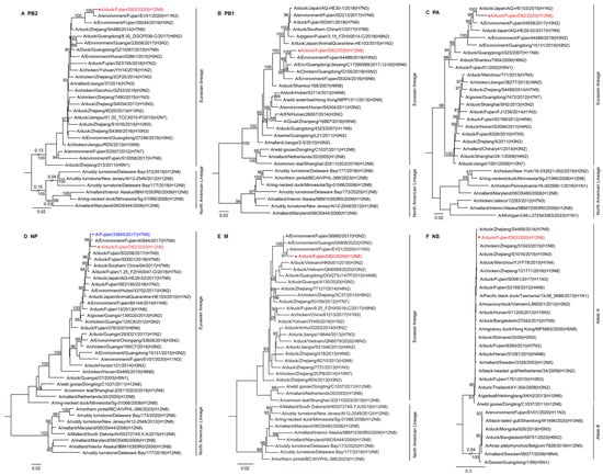 Phylogenetic analyses of the internal genes of H12N8 virus. Phylogenetic trees of the internal genes were generated by employing the maximum-likelihood method with the IQ-TREE algorithm. The regions of nucleotide sequence used for the phylogenetic analyses were as follows: PB2, 37-2307; PB1, 25-2298; PA, 25-2175; NP, 46-1542; M, 26-1007; and NS, 29-849. The trees of PB2 (A), PB1 (B), PA (C), NP (D), M (E), and NS (F) were rooted to A/equine/Prague/1/1956 (H7N7). The virus in red was used in this study, while the virus isolated from humans was shown in blue.