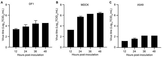 MDCK, A549, or DF1 cells were grown on 12-well plates and infected with the virus at an MOI of 0.01. The inoculum was removed after 1 h of incubation. After three washes with PBS, the cells were supplemented with DMEM containing tosylsulfonyl phenylalanyl chloromethyl ketone (TPCK)-treated trypsin and were incubated at 37 °C. The virus-containing cell supernatant was collected at 12 h, 24 h, 36 h, and 48 h p.i. and titrated in MDCK cells. The growth curve data shown are the results of three independent experiments.