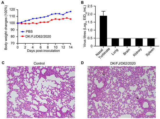 Six-week-old female BALB/c mice were intranasally inoculated with 106 EID50 of the virus in a volume of 50 μL. Three mice were euthanized, and the brain, nasal turbinate, lung, spleen, and kidney were collected for virus titration in embryonated chicken eggs. Mice lungs were fixed in 10% formalin at 3 d p.i. and then stained with H&E for histological analysis. The remaining five mice were monitored daily for weight loss and survival over a 14-day period. Mice inoculated with PBS served as a control group to observe changes in body weight and any pathological effects.