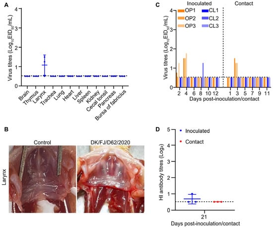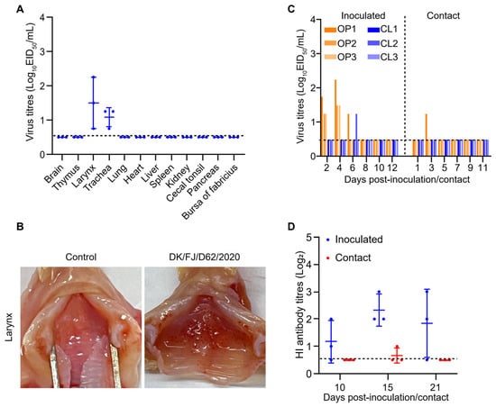 To investigate the virus replication and transmission in chickens, three SPF chickens were intranasally inoculated with the DK/FJ/D62/2020 virus with 106 EID50. The birds were euthanized on 3 d p.i. to detect virus titers in different organs. The virus was recovered from the larynx and trachea of all three chickens, indicating that the DK/FJ/D62/2020 virus could infect the birds and replicate in the upper respiratory tract (Figure 7A). Importantly, all three chickens showed hemorrhage at the laryngeal inlet (Figure 7B). In the transmission study, viruses were detected in the oropharyngeal swabs on day 2 and day 4 in all three inoculated chickens, while it was detected in only one bird at day 3 in the contact group (Figure 7C). The virus triggered production of low HI antibody titers in the inoculated chickens but not in contact chickens (Figure 7D). These findings suggest that chickens are relatively susceptible hosts for the H12N8 virus, which can replicate in the upper respiratory tract but is not readily transmitted via direct contact.
