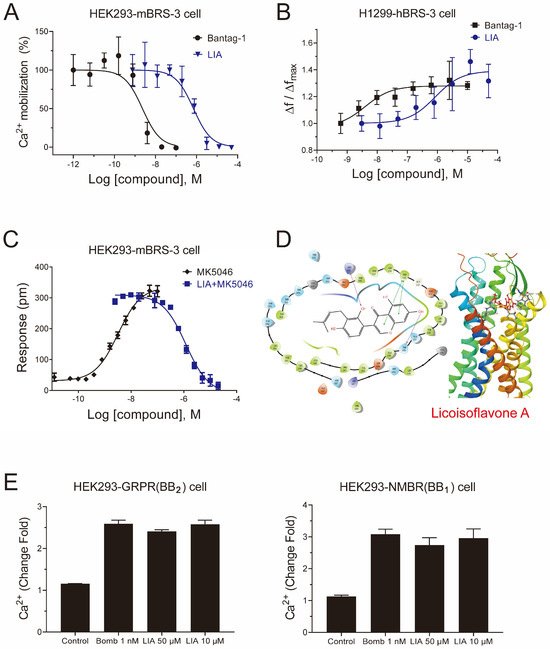 Pharmacological characterization of LIA as a novel antagonist of BRS-3. Dose–inhibition curves of LIA for 50 nM MK-5046-induced calcium mobilization in HEK293-mBRS-3 cells (A), IP-1 accumulation in H1299-hBRS-3 cell (B), and DMR responses in HEK293-mBRS-3 cells (C). The predicted binding model of LIA with human BRS-3 (D). The ability of LIA to reverse 1 nM Bomb-induced calcium mobilization in HEK293 expressing GRPR and NMBR cells (E). Data shown are means ± SD, n = 3. Dose–response curves were fitted using the log(agonist) vs. response using GraphPad Prism 8.0 software.