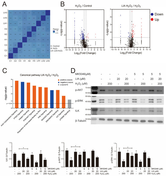 Proteomics analysis of the effect of LIA in H9c2 cells induced by H2O2. Pearson correlation (A) and Volcano plots (B). The red dots represent proteins that were upregulated (p < 0.05), and the blue dots represent proteins that were downregulated (p < 0.05). The black dots represent proteins with fold change < 1.5 or without significant changes (p > 0.05). “Canonical pathway” enrichment (C), the dash line represents p = 0.05. The effects of LIA on the protein expressions of ILK, p-P70S6K, p-ERK1/2, and p-AKT (Ser473) were detected by Western blot (D). The values are represented as means ± SD, n = 3. * p < 0.05.