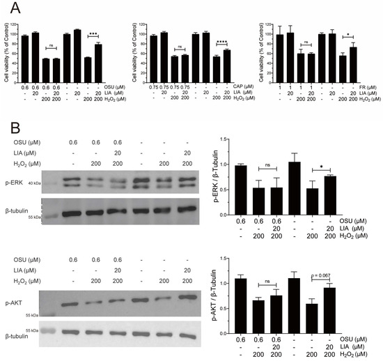 Cell viability was assessed by MTT assay. Cells were seeded into a 96-well plate at a density of 3 × 103 cells per well, and the marginal wells were filled with PBS. Cells were incubated with various concentrations of LIA or Bantag-1 1 h before exposure to H2O2. For signaling pathway inhibitors, cells were pretreated 15 min before adding LIA or Bantag-1. Twenty-four hours after the H2O2 treatment, MTT solution (0.5 mg/mL, Sigma-Aldrich, St. Louis, MO, USA) was added to each well for another 4 h at 37 °C. After the incubation, the MTT reagent was removed and replaced with 100 μL of DMSO to dissolve the formazan for 15 min. Cell viability was analyzed by measuring the optical density at 570 nm with a microplate reader. All experiments were repeated in triplicate.