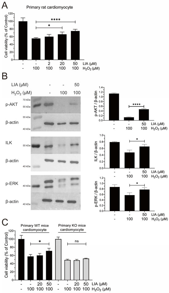Consistent with the observations in H9c2 cells, treatment with LIA effectively activated the ILK, AKT (Ser473), and ERK1/2 signaling pathways in primary rat cardiomyocytes subjected to H2O2-induced injury, as depicted in Figure 5B.