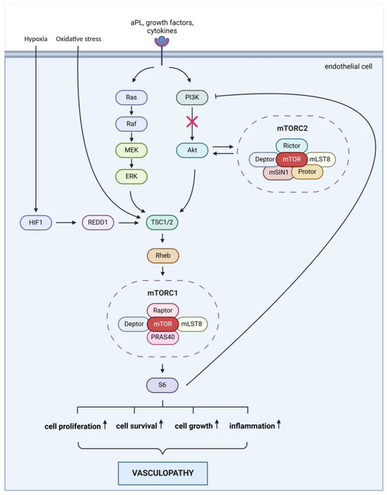 A putative schematic representation of the mTOR signaling pathway in APS. After stimulation with growth factors, cytokines, or aPL, mTORC1 can also be activated in the RAS/RAF/MEK/ERK or PI3K/AKT signaling pathways via the phosphorylation of the TSC complex and Rheb binding. pAKT negativity suggests that mTORC1 activation occurs via the RAS/RAF/MEK/ERK pathway to increase S6 protein. In addition to regulating mTORC1, pAKT is also a substrate of mTORC2; therefore, the absence of pAKT may indicate that mTORC2 is not activated. Furthermore, mTORC1 inhibits mTORC2 activation by negatively regulating PI3K/AKT signaling through the S6 protein. Increased hypoxia and oxidative stress may also enhance mTORC1 activity involving HIF-1, REDD1, the TSC complex, and Rheb protein. Active mTORC1 and elevated S6 levels mediate increased cell proliferation, cell survival, cell growth, and inflammation, which promote vasculopathy (APS, antiphospholipid syndrome; aPL, antiphospholipid antibodies; mTOR, mammalian target of rapamycin; mTORC1, mTOR complex 1; mTORC2, mTOR complex 2; Raptor, Regulatory-associated protein of mTOR; Deptor, DEP-domain-containing mTOR-interacting protein; PRAS40, Prolin-rich AKT substrate 40 kDa, mLST8, Mammalian Lethal with Sec-13 protein 8; Rictor, Rapamycin-intensive companion of mTOR; mSIN1, Mammalian stress-activated map kinase-interacting protein 1; Tel2, Telomere maintenance 2; Protor, Protein observed with rictor; Tti1, Tel2-interacting protein; PI3K, phosphatidylinositol-3-kinase; AKT, protein kinase B; MEK, mitogen-activated protein kinase; ERK, extracellular-signal-regulated kinase; TSC, tuberous sclerosis; Rheb, RAS homolog enriched in brain; REDD1, DNA damage-inducible transcript; HIF-1, hypoxia inducible factor 1; S6, ribosomal S6 protein). Created with BioRender (https://BioRender.com/h69q286 (accessed on 16 March 2025)).