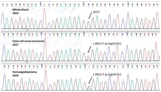 Variant c.481C>T (p.Arg161Ter) in different primary tumors of the patient; sequencing of VHL exon 3 with a reverse primer, WT—“wild type” (normal).