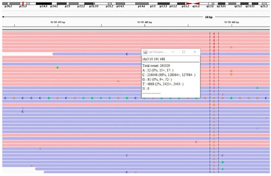 A blood genomic DNA sample, in which we had not previously detected VHL germline mutations using Sanger sequencing, was used to search for a mosaic variant. To obtain an amplification library, the Prep&Seq™ U-target module system was used, and primers were synthesized specifically for sequencing the region containing the position VHL:NM_000551.4:c.481C>T. Targeted sequencing on the Illumina NextSeq platform (“Illumina”, San Diego, CA, USA) allowed us to achieve coverage on the position of interest of x261029, which is sufficient to detect mosaicism (Figure 2). It was shown that 4868 reads demonstrated the variant allele T; the ratio of forward/reverse reads was 0.99 (2425/2443), other variant alleles at this position (A and G) were represented in less than 0.05% of reads, and one of them showed an 8-fold difference in the representation of forward/reverse reads, which allowed us to filter them out as sequencing artifacts. The proportion of the mutant T allele was determined to be 2%, which was further considered as molecular confirmation of the mosaic form of VHLS with low representation of the mutant allele. The predictive significance of the c.481C>T (p.Arg161Ter) mutation, according to the AMP/ASCO/CAP recommendations, was determined at the IA level; since the identified variant is the cause of the disease, in cases of multiple/metastatic tumors, targeted therapy by belzutifan is approved by the FDA and recommended in the NCCN guidelines [,]. It should be noted that we completed the confirmation of the mosaic form of VHLS and the preparation of the diagnostic report before the date of the concilium dedicated to targeted therapy options for the patient (previously, the recommendation of belzutifan had been postponed due to the lack of molecular genetic confirmation of the VHLS diagnosis).